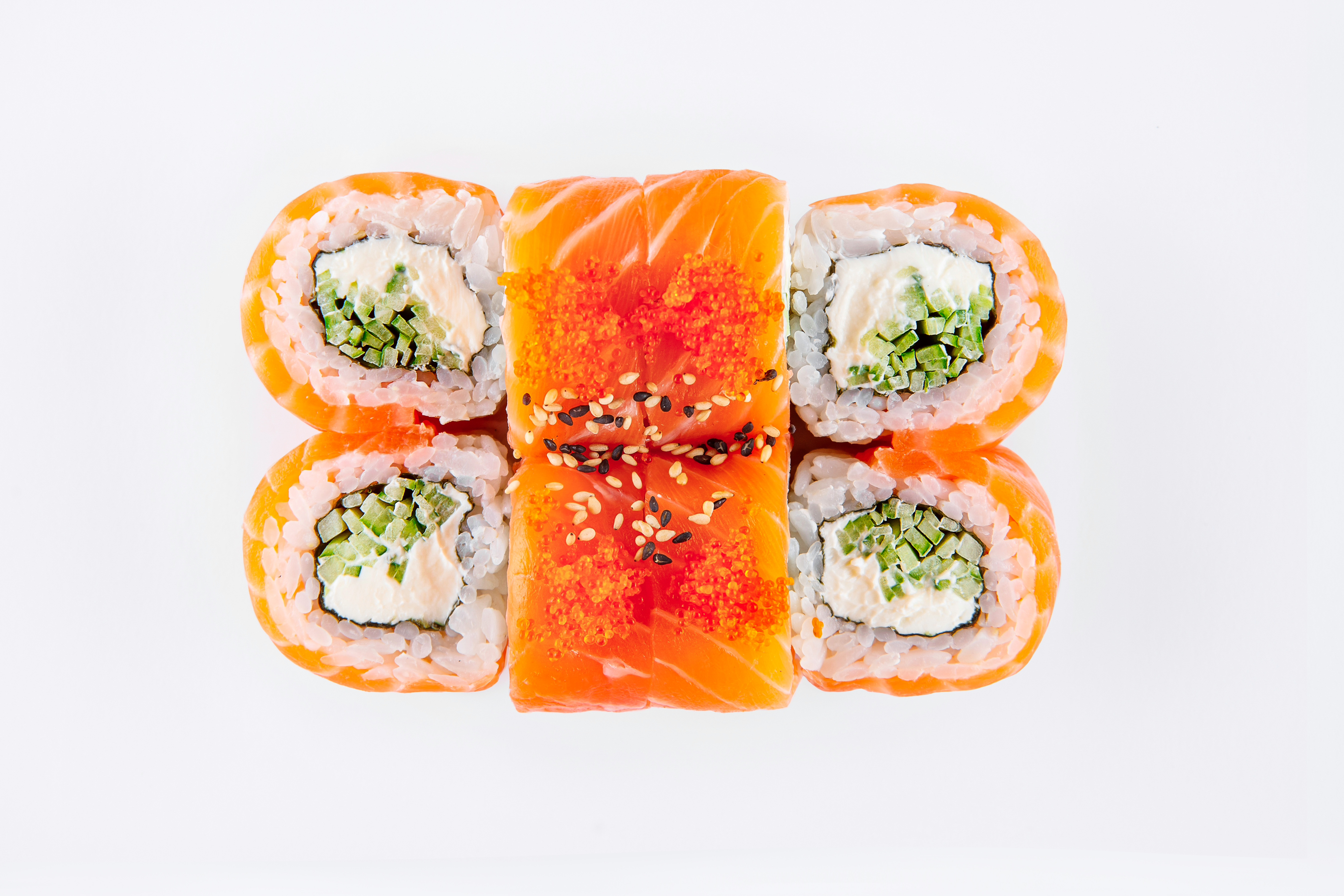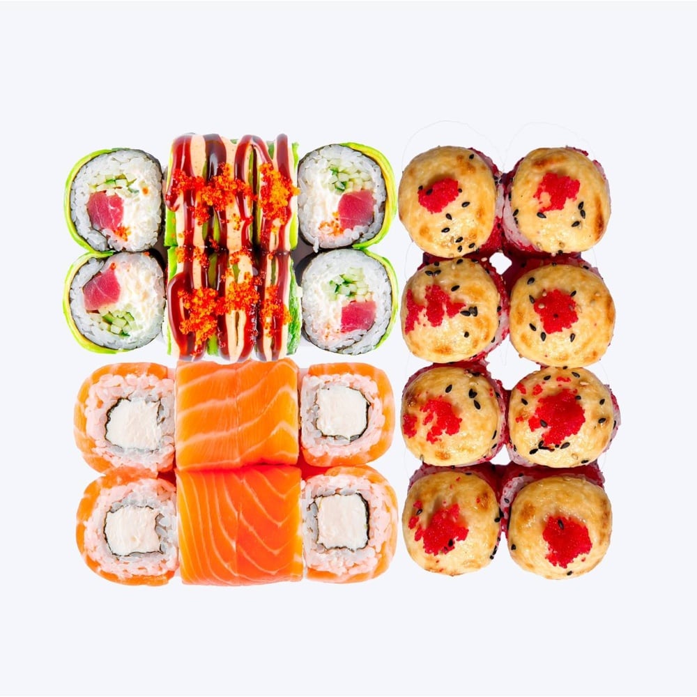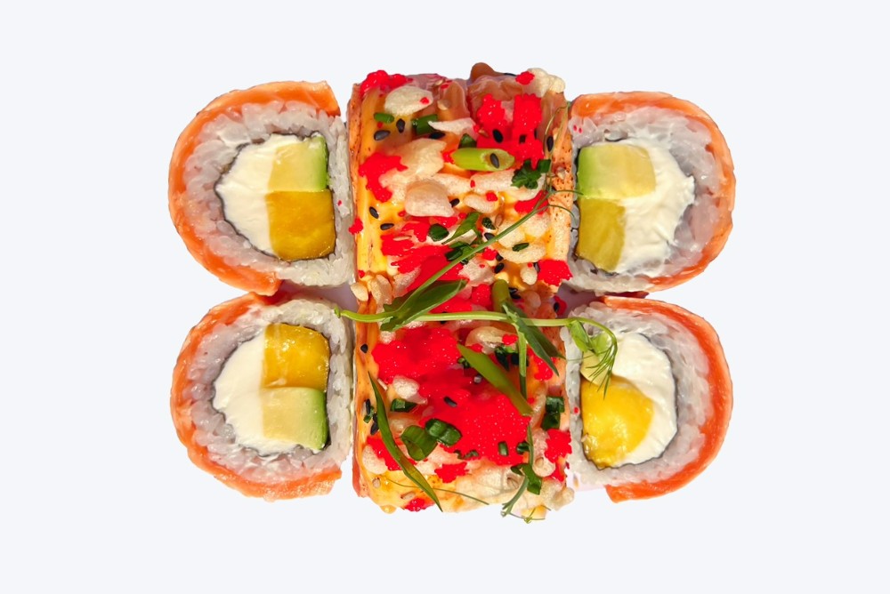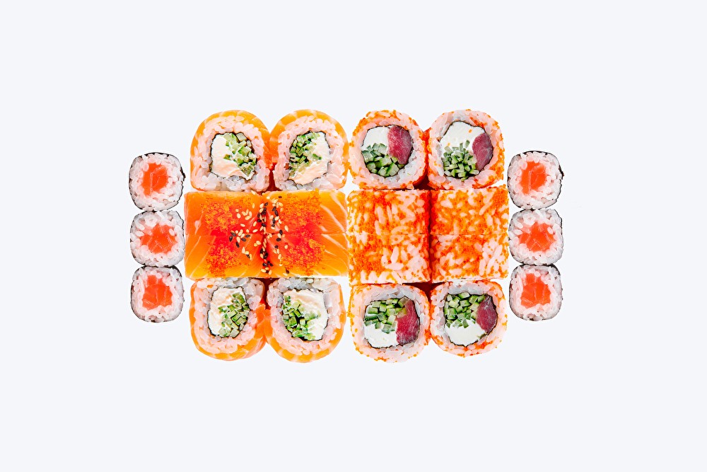 1225 г. (42 шт.) | Дунамото з лососем, Олімп, Боніто з лососем та філадльфією, Філадельфія в кунжуті з лососем, Філадельфія в ікрі з лососем.