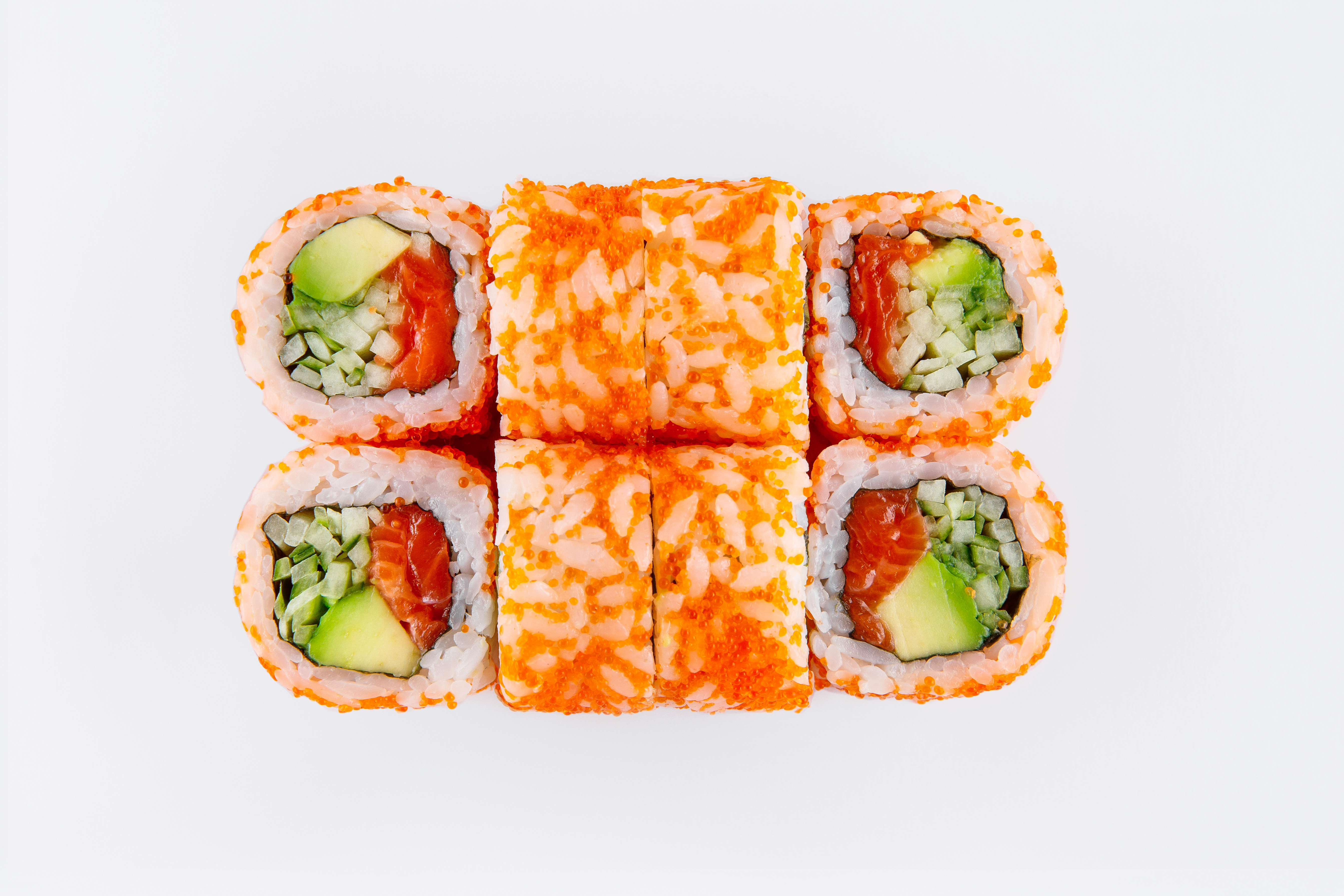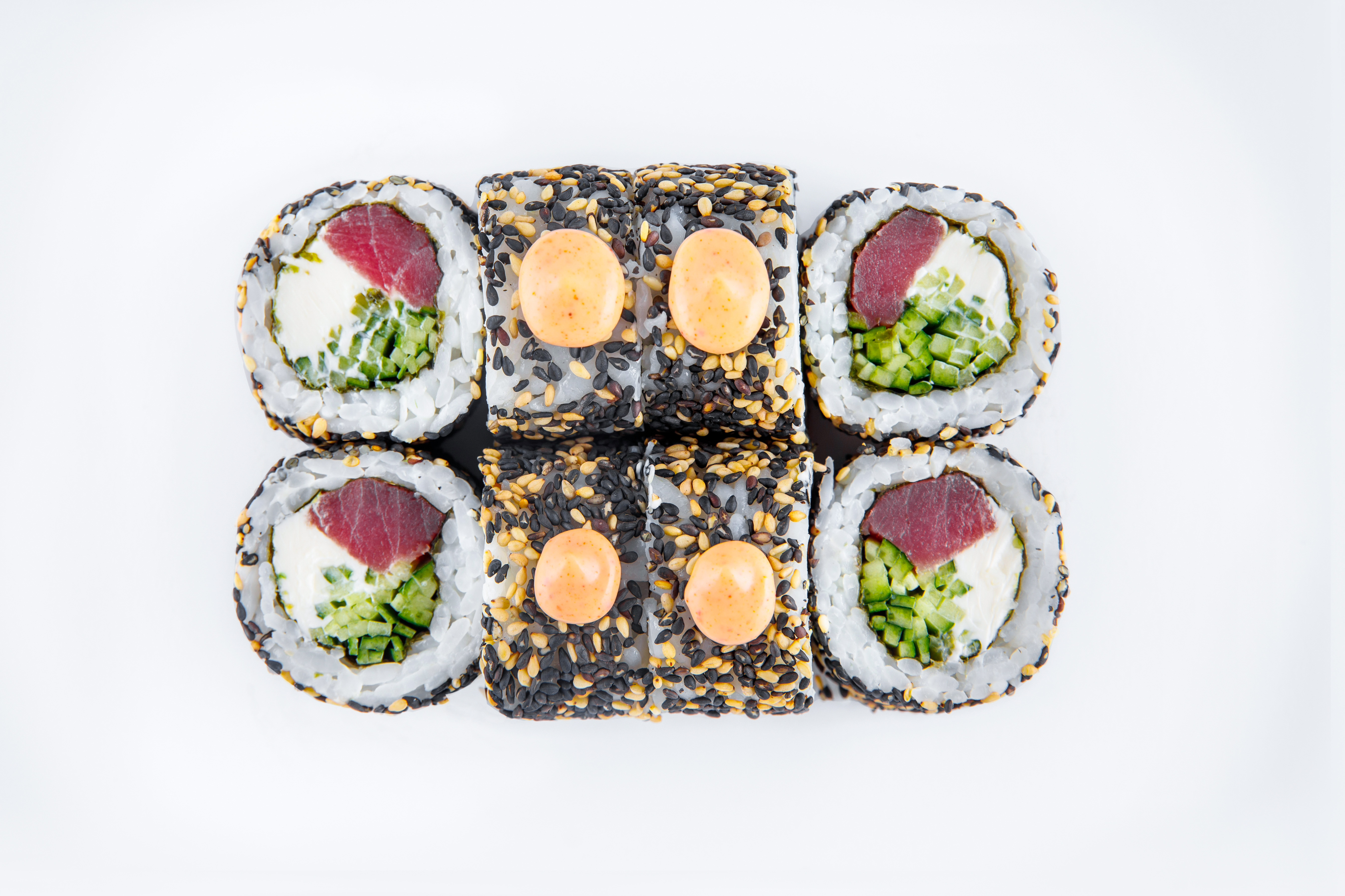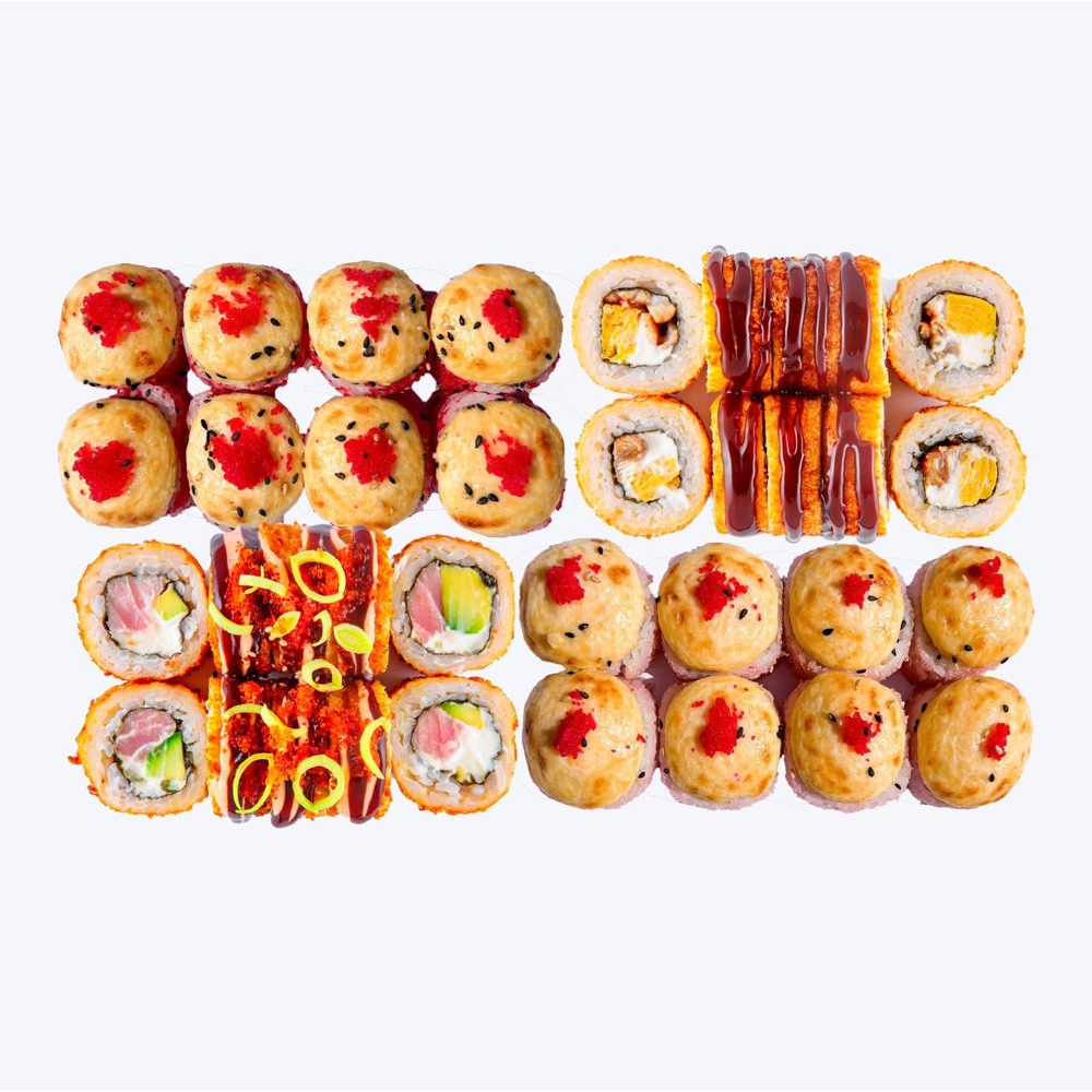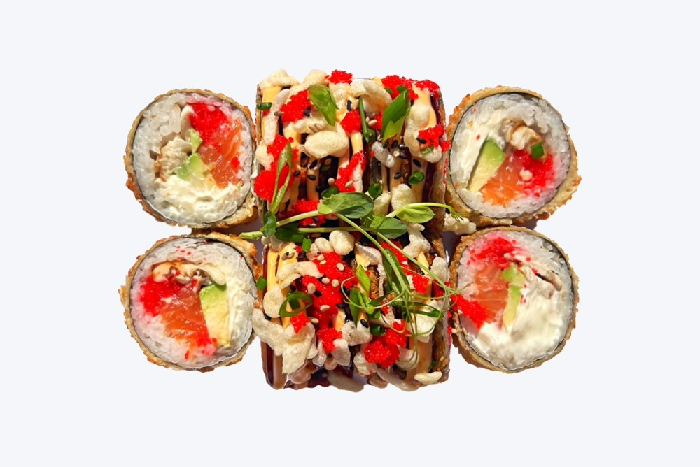 1225 г. (42 шт.) | Дунамото з лососем, Олімп, Боніто з лососем та філадльфією, Філадельфія в кунжуті з лососем, Філадельфія в ікрі з лососем.